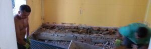 In contemporanea alla zona esterna, viene sbancato l’interno al piano terra, in cui si trovavano travi in cemento con sovrastanti tavelle di laterizio e successiva pavimentazione in ceramica, da notare il concetto costruttivo dell’epoca con camera di ventilazione con bocchette laterali di presa d'aria, molto all’avanguardia per l’anno di costruzioni del fabbricato.